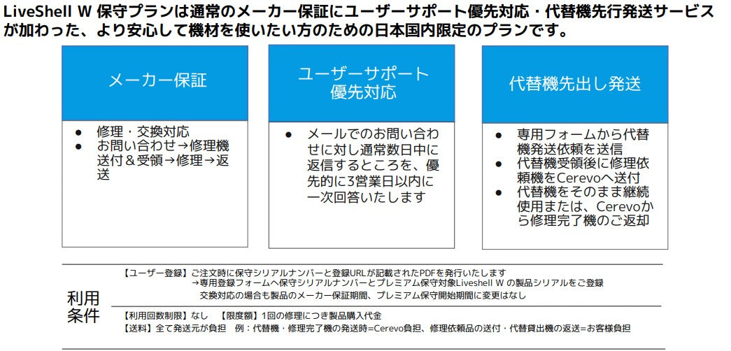LiveShell Wの通常のメーカー保証にユーザーサポート優先対応・代替機先行発送サービスが新規5年分加わった、より安心して機材を使いたい方のための日本国内限定のプランです。